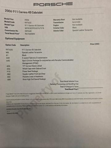 Elway Inspected and protected vehicle, Includes 60 day / Unlimited mile warranty,, 2006 Porsche 911 Carrera 4S, Exterior: Basalt Black, Interior: Terracotta, Special leather terracotta, 5 Speed tiptronic S transmission, Sport chrono package, 19" Carrera classic wheel, Wheel caps with colored crest, Power seat package, Supple leather front and rear, Porsche crest in headrest, Bose high end sound package, Heated seats, 2006 Porsche 911 Carrera 4S | AWD | 38,732 Miles | Timeless Performance Experience iconic Porsche performance with this 2006 Porsche 911 Carrera 4S, finished with legendary all-wheel drive handling and showing only 38,732 original miles. This low-mileage Carrera 4S represents the perfect balance of everyday drivability and true sports car pedigree, making it one of the most sought-after 997-generation 911s on the market. Powered by a naturally aspirated 3.8L flat-six engine, the Carrera 4S delivers exhilarating throttle response, razor-sharp steering, and unmistakable Porsche exhaust tone. The AWD system provides confident traction in all driving conditions, while the wide-body stance, upgraded brakes, and sport-tuned suspension separate the 4S from standard Carrera models. Inside, youll find a driver-focused cockpit with premium materials, supportive sport seating, and classic Porsche ergonomics. This 911 is equally at home carving mountain roads, cruising highways, or serving as a collector-grade weekend car. Key Highlights: Low miles: 38,732 Carrera 4S wide-body AWD configuration 3.8L flat-six Porsche engine Precision Porsche handling and braking Legendary 911 reliability and performance Clean, timeless design with strong resale value This 2006 Porsche 911 Carrera 4S for sale is ideal for enthusiasts searching for a low-mileage Porsche, AWD sports car, or classic 911 investment. Vehicles like this are becoming increasingly difficult to find, especially with mileage this low and the desirable 4S package. If youre searching for a Porsche 911 Carrera 4S AutoTrader listing, used Porsche sports car, or high-performance luxury coupe, this example checks every box. Contact us today to schedule a test drive or request additional details. Nationwide buyers welcome., 911 Carrera 4S, 2D Cabriolet, 3.8L H6 SMPI DOHC, 5-Speed Automatic with Tiptronic S, AWD, Basalt Black Metallic, Terracotta w/Full Leather Seat/Interior Trim, 19" Carrera Classic Wheels, Convertible roof lining, Convertible roof wind blocker, Front Bucket Seats, Front Center Armrest, Full Leather Seat/Interior Trim, Garage door transmitter: HomeLink, Heated door mirrors, Leather Seat Trim, Leather Shift Knob, Leather steering wheel, Outside temperature display, Passenger vanity mirror, Power convertible roof, Power passenger seat, Split folding rear seat, Sport Chrono Package Plus, Sport steering wheel, Terracotta Instrument Dials, Tilt steering wheel, Trip computer. 2006 Porsche 911 Basalt Black Metallic Carrera 4S AWD 5-Speed Automatic with Tiptronic S 3.8L H6 SMPI DOHC